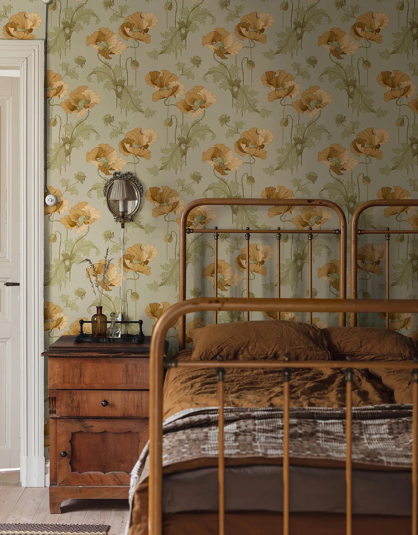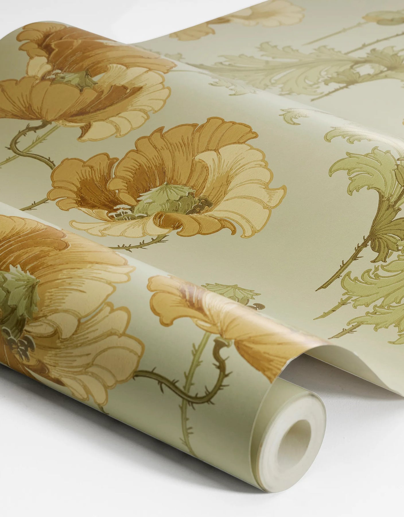 Die Jugendstiltapete Tiffany in Gelb zeigt sich in einer harmonischen, warmen Farbwelt, die an historische Leinölfarben aus dem frühen 20. Jahrhundert erinnert. Sandgelbe und goldockerfarbene Mohnblüten entfalten sich zwischen zartgrünen, weich verschlungenen Blättern – ein Farbspiel, das sanft, naturverbunden und zugleich kunstvoll wirkt. Der helle, leicht gedämpfte Grünton des Hintergrunds lässt das florale Motiv besonders authentisch erscheinen und schafft eine ruhige, freundliche Atmosphäre. Durch den klassischen Nass-in-Nass-Leimdruck erhält jede Bahn eine lebendige, charaktervolle Oberfläche, bei der insbesondere die Blüten eine dezente, leicht glänzende Wirkung entwickeln. Diese besondere Veredelung verleiht dem historischen Design spürbare Tiefe und einen handwerklichen Charme. Ideal für Schlafzimmer, Wohnräume oder vintage-inspirierte Interieurs, die Wärme und Natürlichkeit betonen.