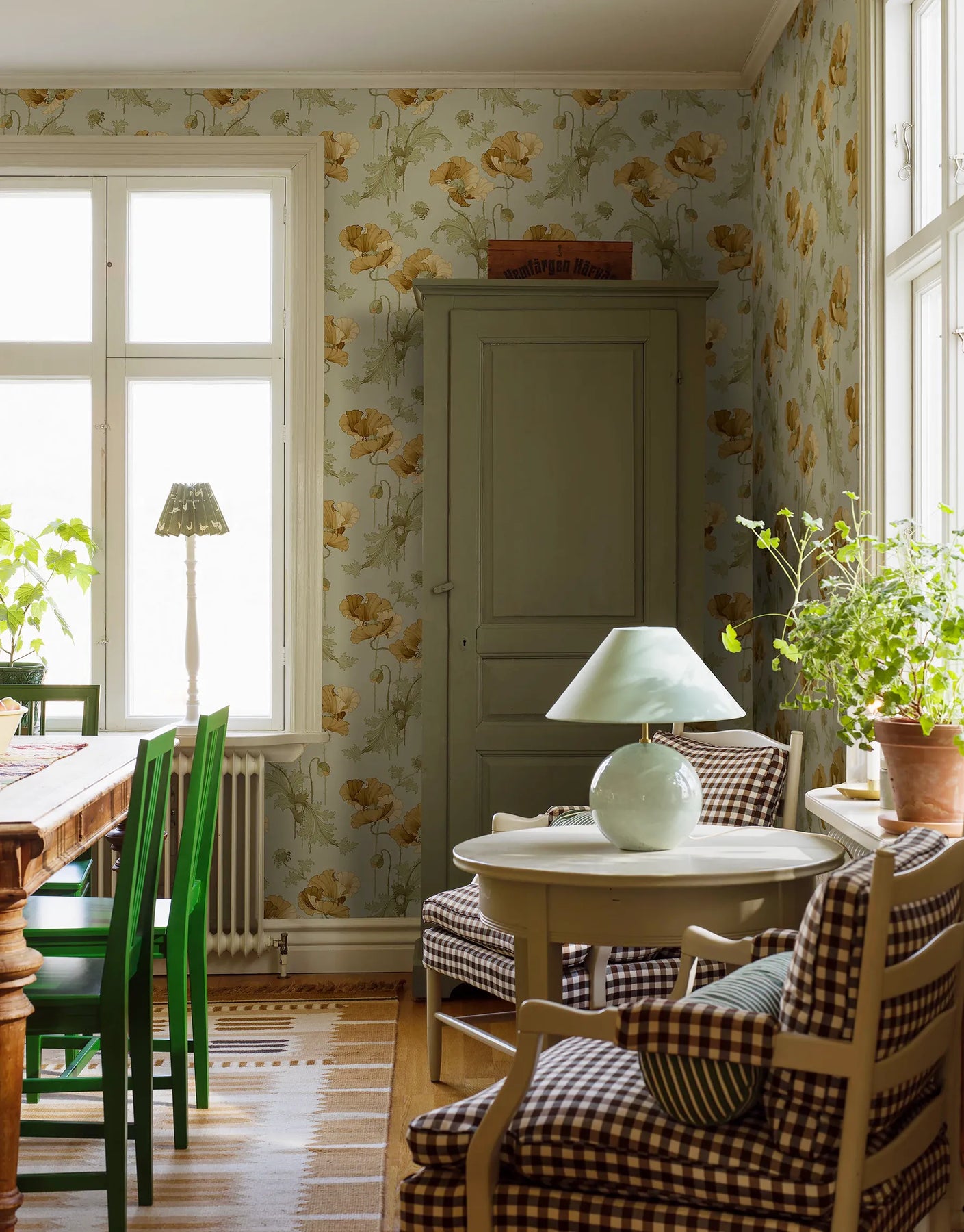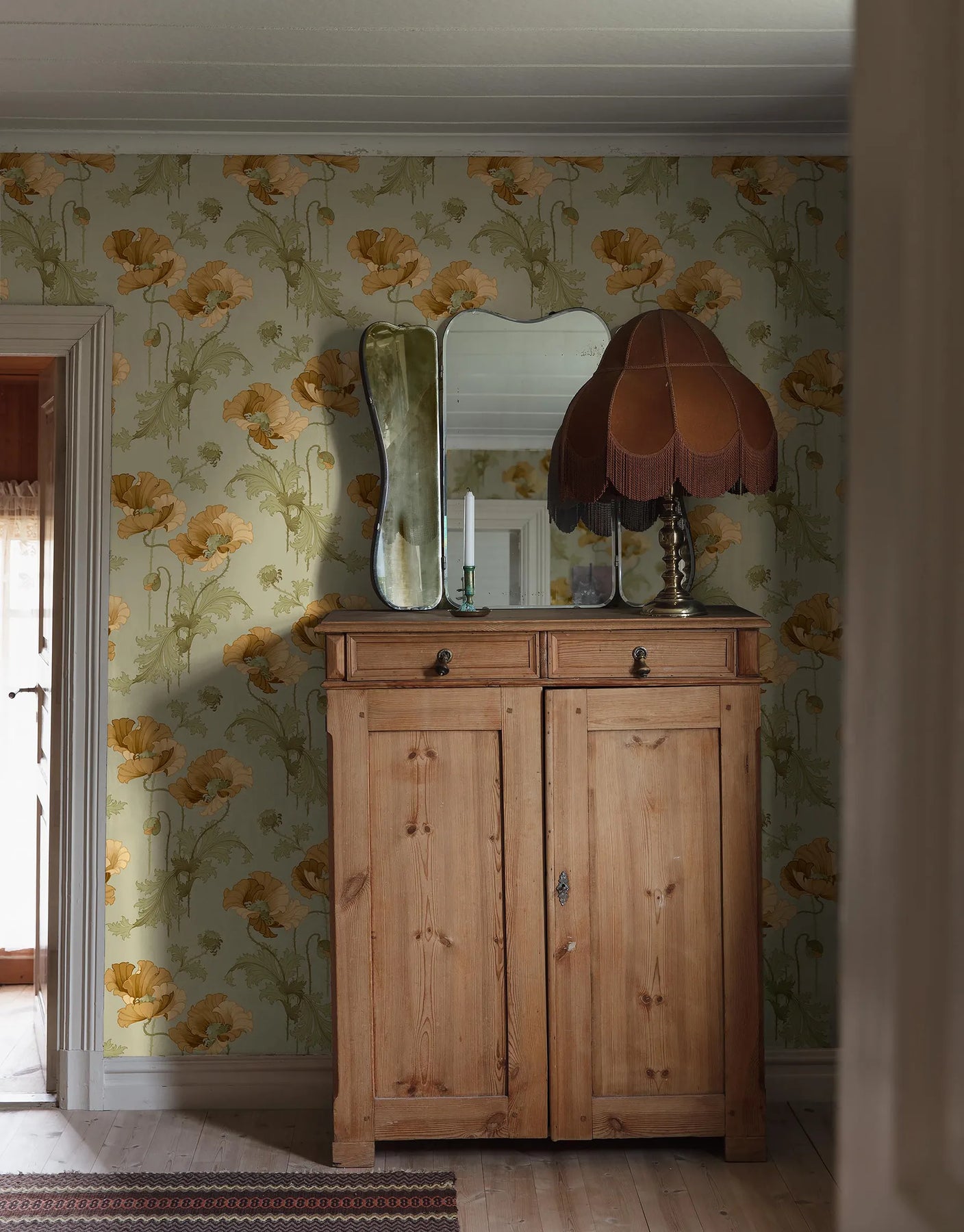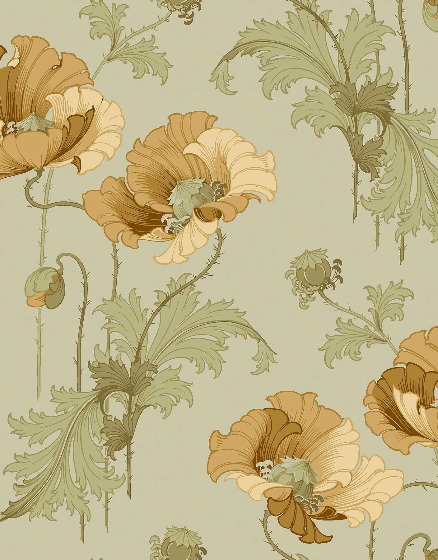 Diese Tiffany Tapete kombiniert sandgelbe und goldockerfarbene Blüten mit zartgrünen Blättern auf einem weichen, hellgrünen Hintergrund. Die Farbpalette erinnert an traditionelle Leinölfarben und wirkt natürlich, beruhigend und zeitlos.