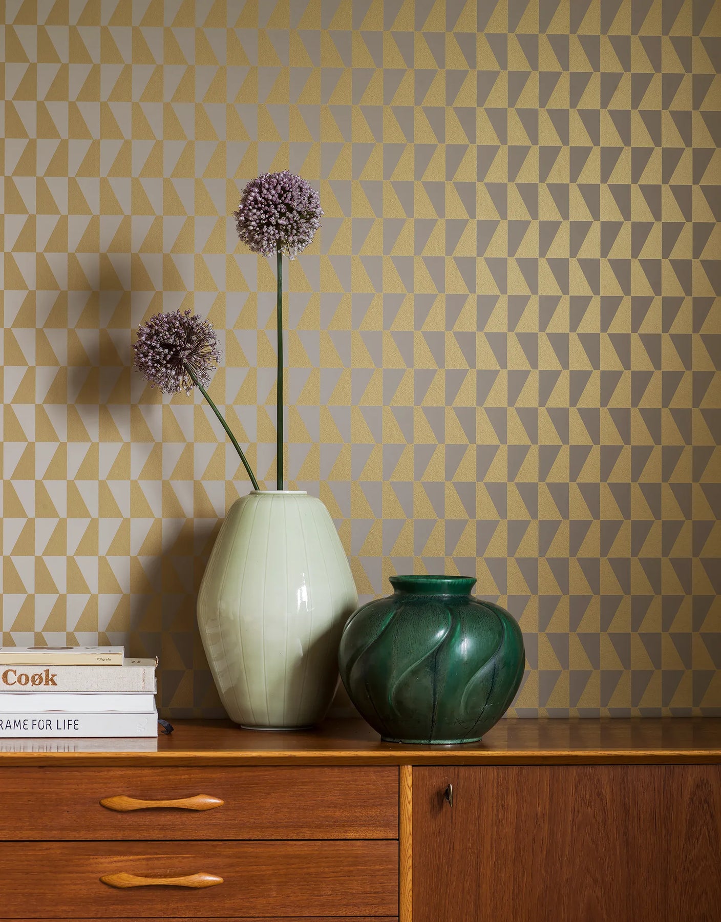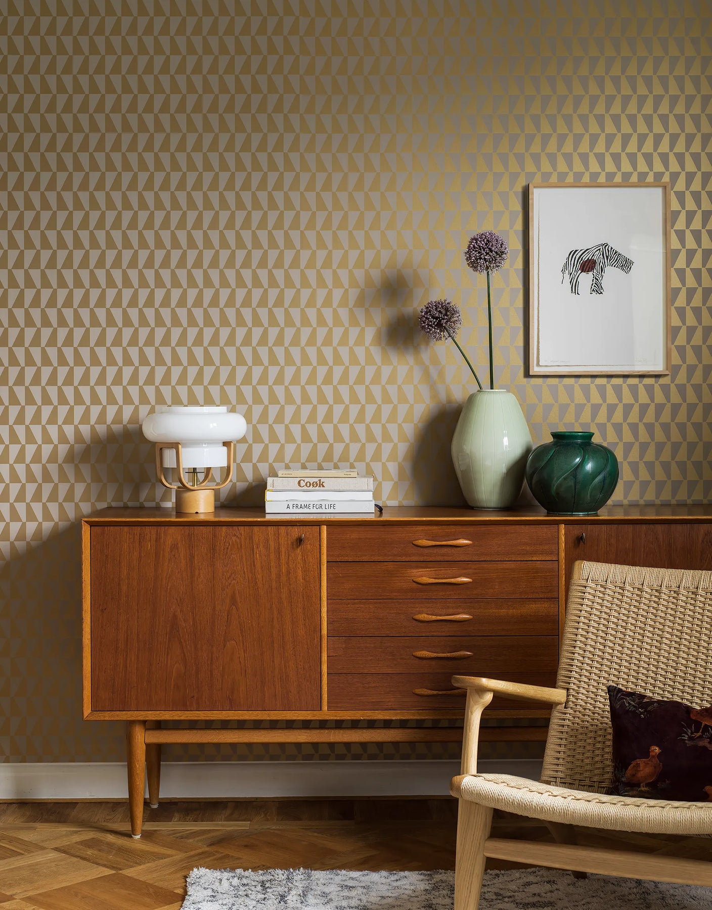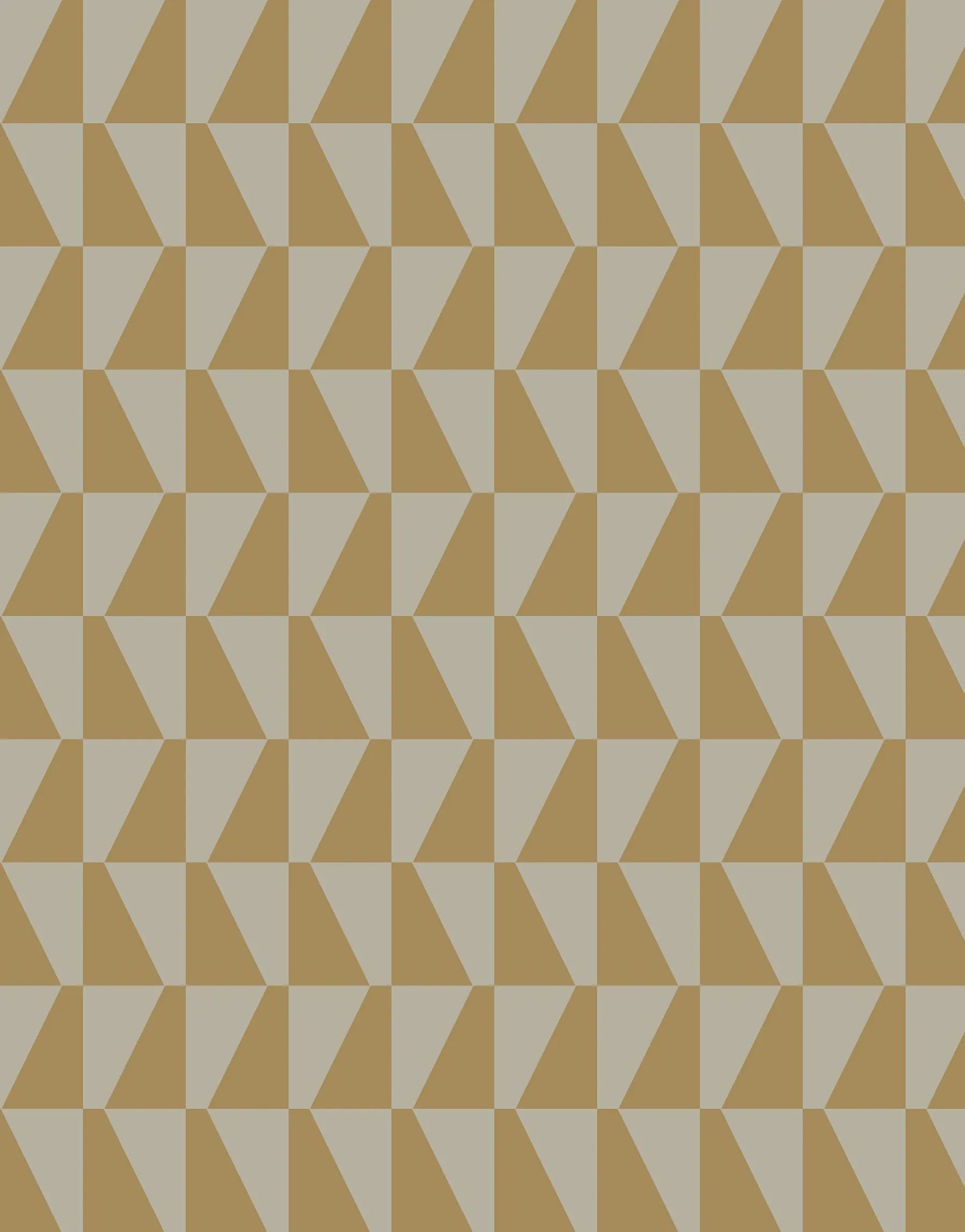 Die Trapez Tapete in Beige und metallischem Gold basiert auf einem ikonischen Designentwurf des Designers und Architekten Arne Jacobsen aus den 1950er-Jahren und verbindet skandinavische Designgeschichte mit moderner Eleganz. Die gegensätzlichen Trapezformen bilden harmonische Quadrate, die in Verbindung mit dem goldenen Schimmer eine warme, luxuriöse Tiefe erzeugen. Durch die zweifarbige Gestaltung entsteht ein feiner Metallic-Effekt, der je nach Lichteinfall subtil glänzt und Räumen eine edle, zeitgenössische Atmosphäre verleiht. Ideal für Wohnzimmer, Essbereiche und Schlafzimmer – überall dort, wo ein Mix aus Retro-Flair, grafischer Struktur und dezenter metallischer Glamour-Note gefragt ist.