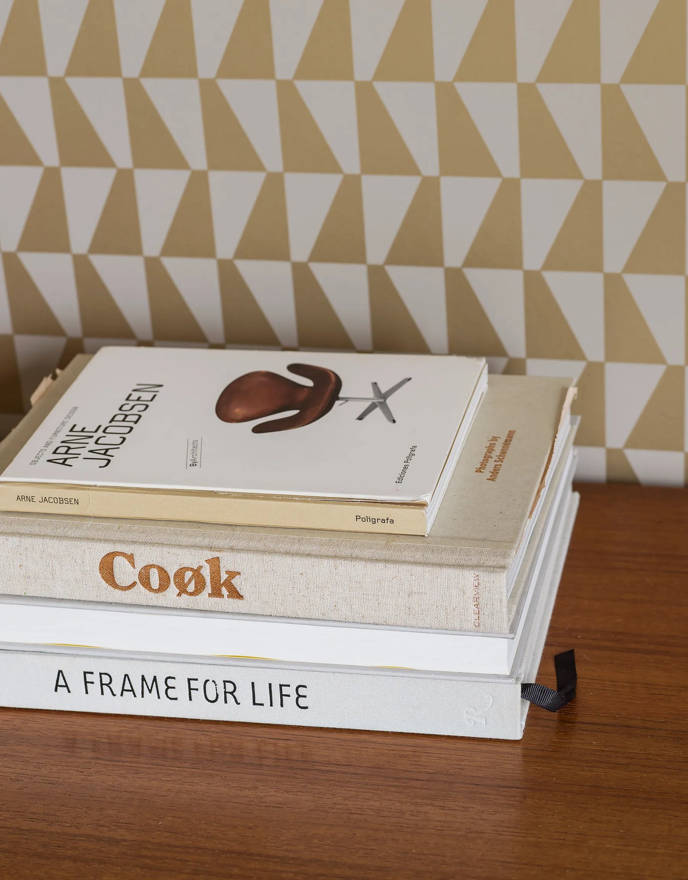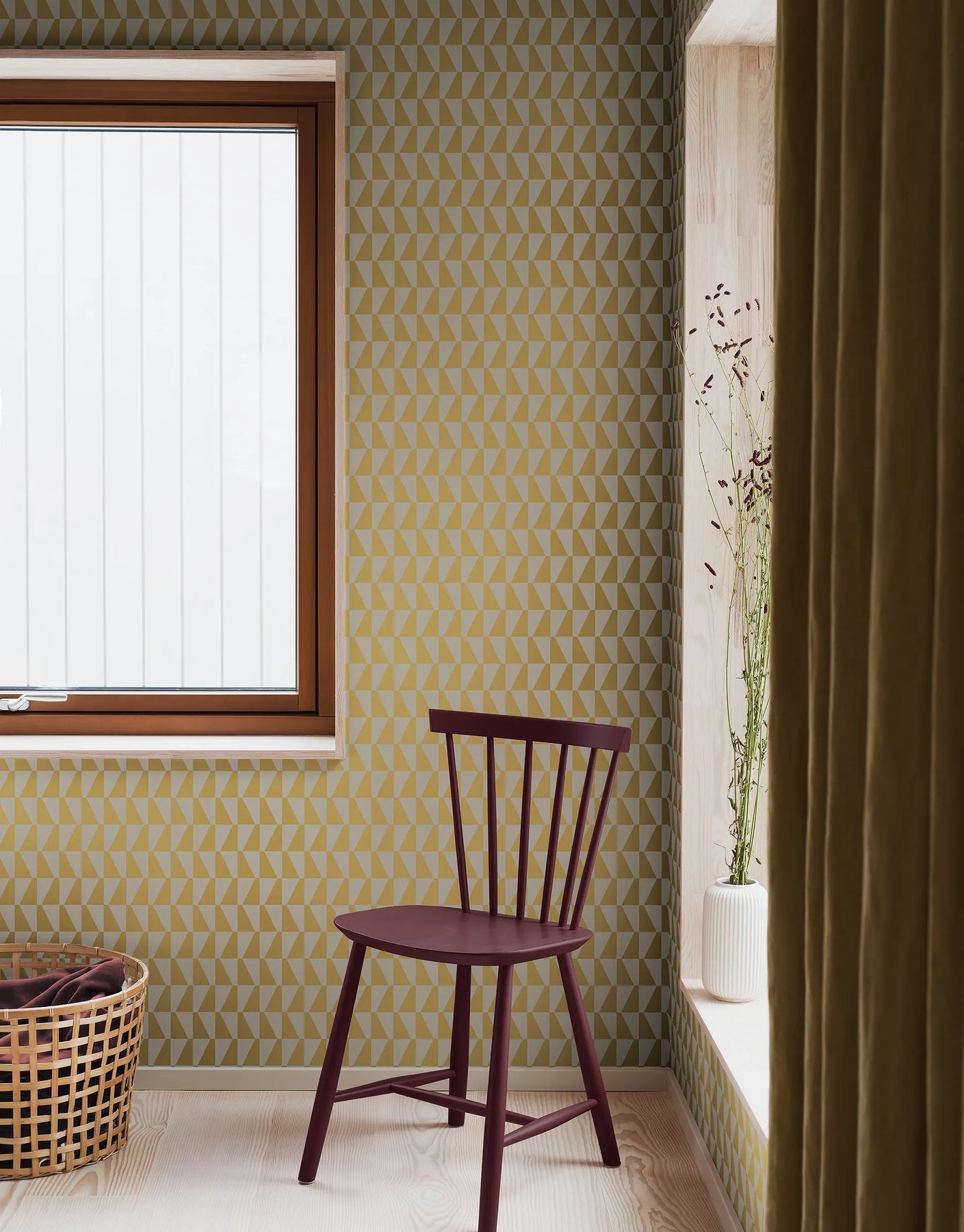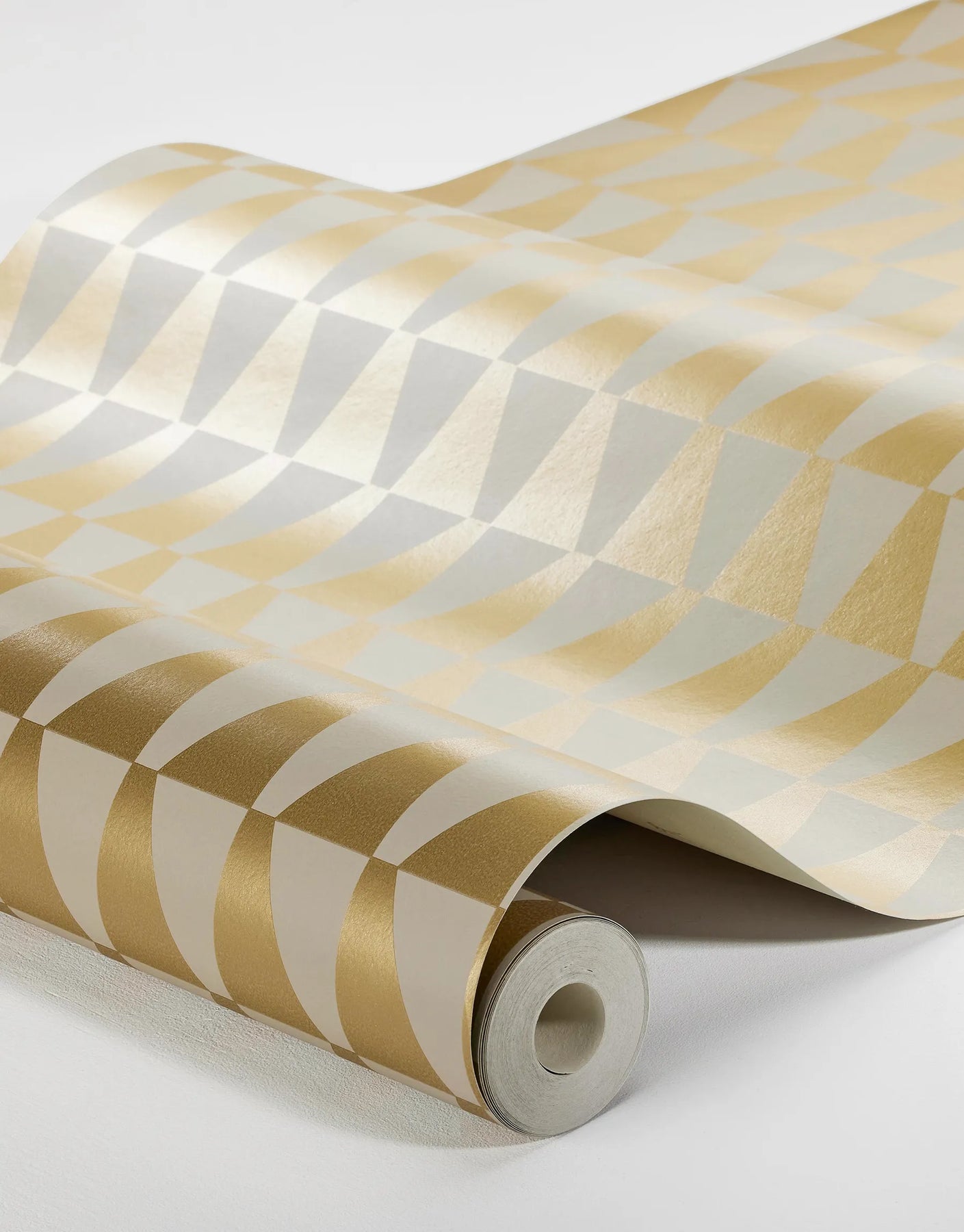 Die Trapez Tapete in Beige und metallischem Gold basiert auf einem ikonischen Designentwurf des Designers und Architekten Arne Jacobsen aus den 1950er-Jahren und verbindet skandinavische Designgeschichte mit moderner Eleganz. Die gegensätzlichen Trapezformen bilden harmonische Quadrate, die in Verbindung mit dem goldenen Schimmer eine warme, luxuriöse Tiefe erzeugen. Durch die zweifarbige Gestaltung entsteht ein feiner Metallic-Effekt, der je nach Lichteinfall subtil glänzt und Räumen eine edle, zeitgenössische Atmosphäre verleiht. Ideal für Wohnzimmer, Essbereiche und Schlafzimmer – überall dort, wo ein Mix aus Retro-Flair, grafischer Struktur und dezenter metallischer Glamour-Note gefragt ist.