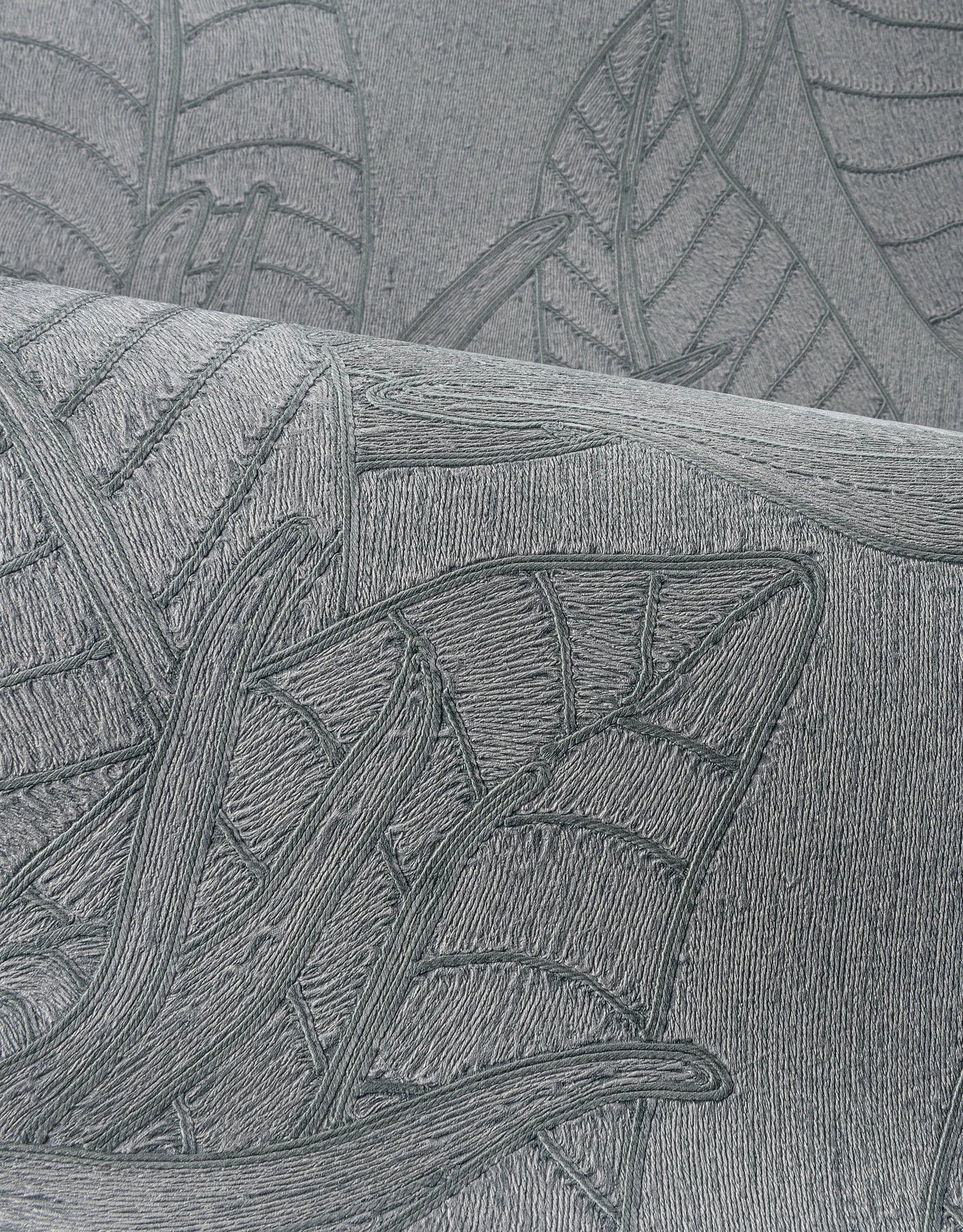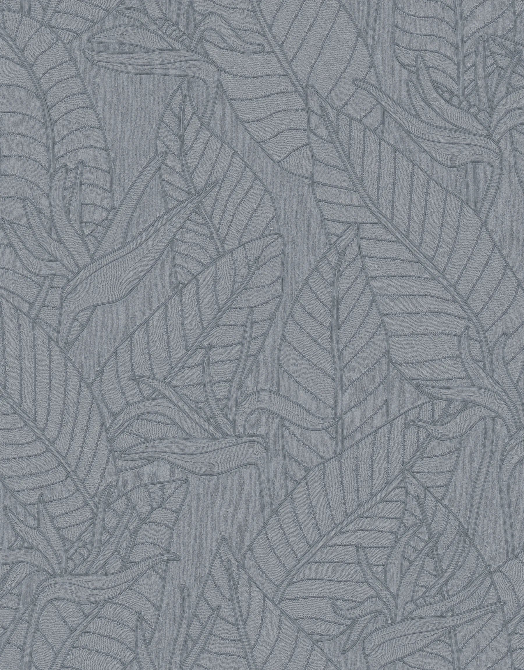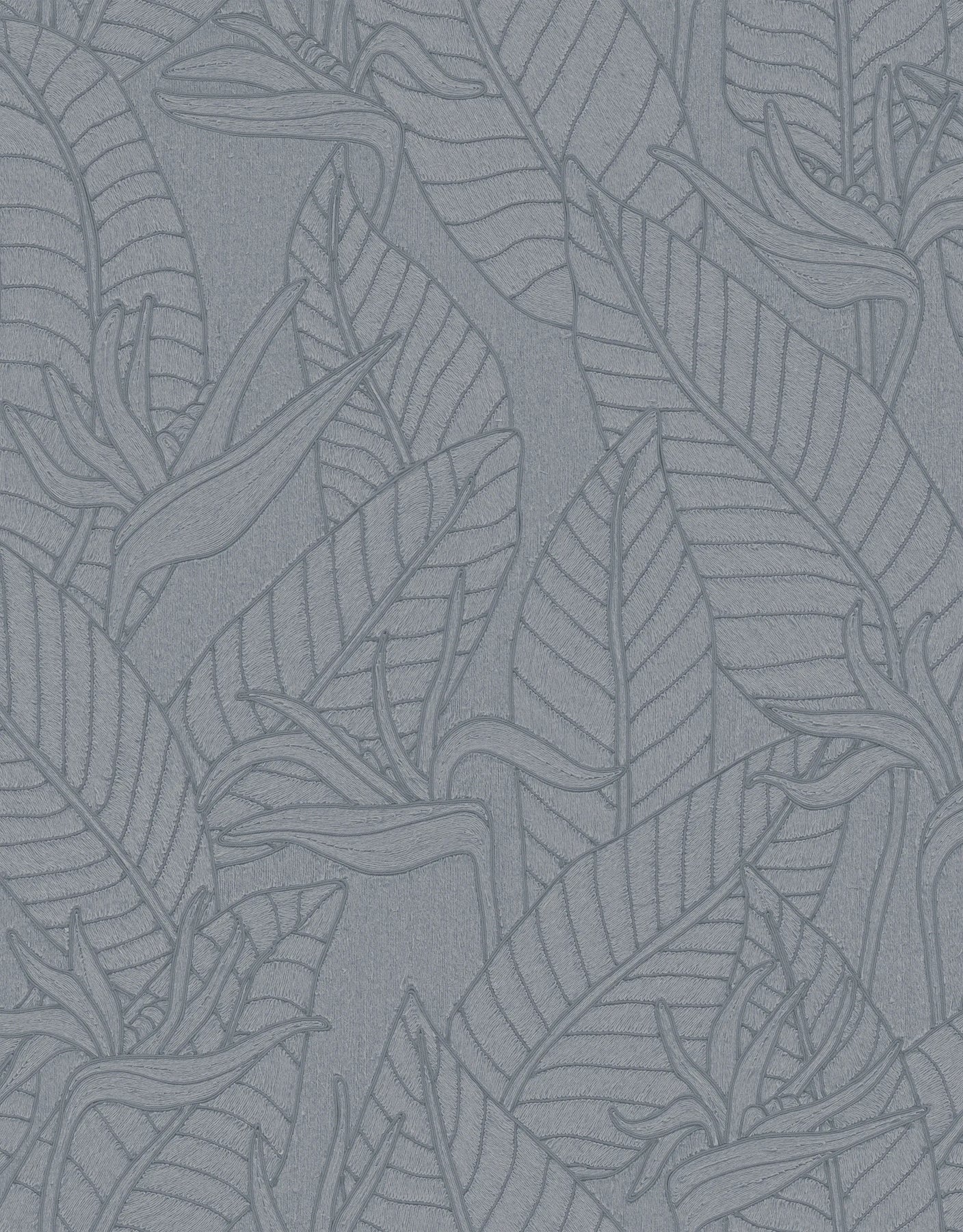 Die Tapete verfügt über Premium-Maße von 1,00 m x 10,05 m und einen Rapport von 95 cm, wodurch die großflächigen, exotischen Motive harmonisch und beeindruckend wirken. Der sanfte Taubenblauton erzeugt eine ruhige, elegante Atmosphäre und hebt die feinen Details des Designs subtil hervor.