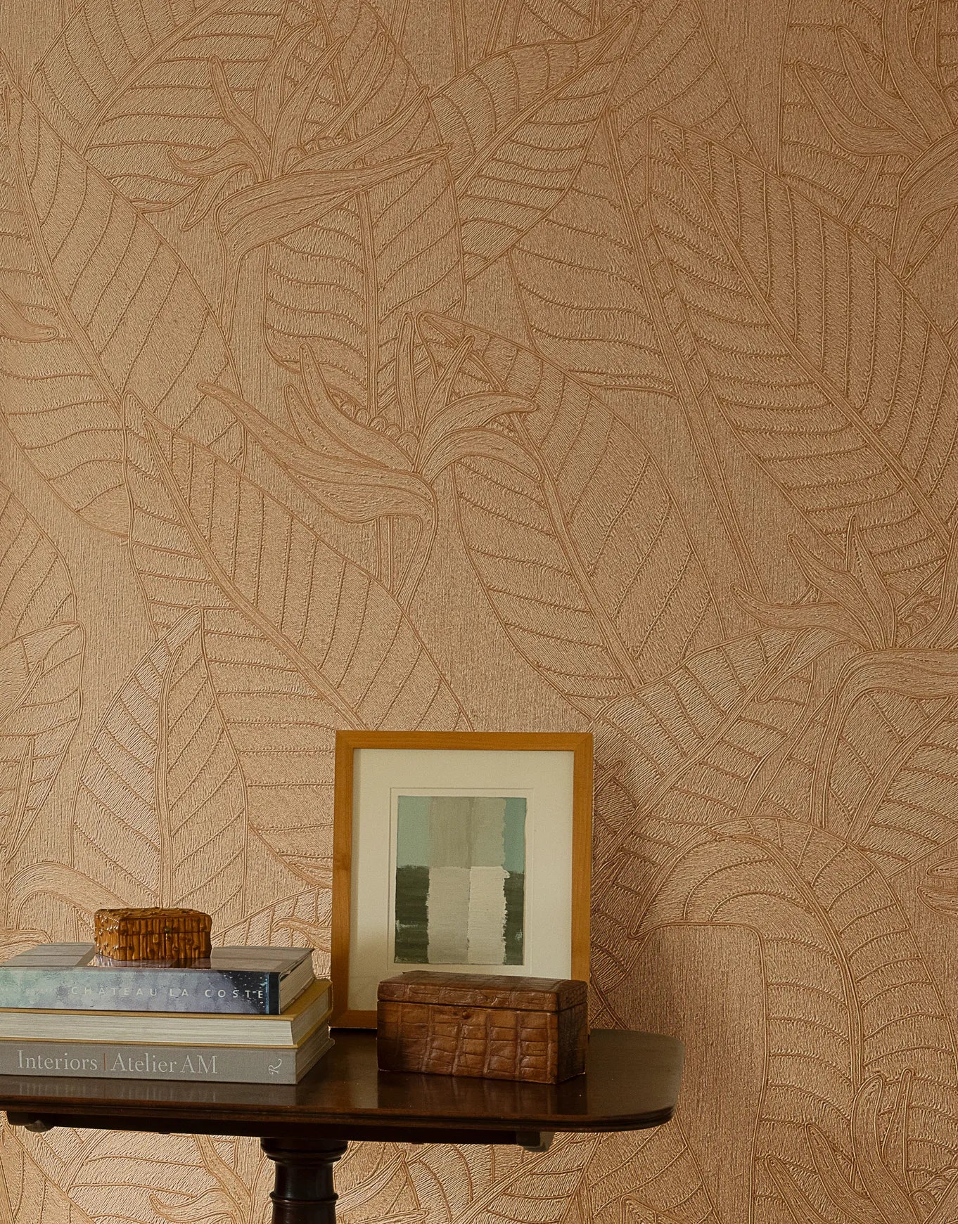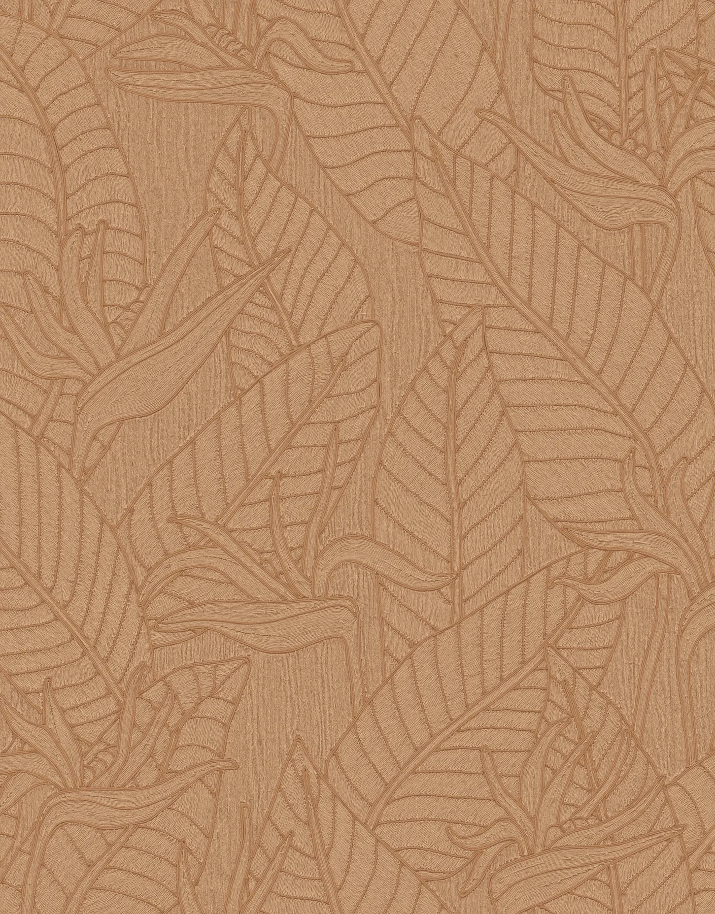 Die Tapete verfügt über Premium-Maße von 1,00 m x 10,05 m und einen Rapport von 95 cm, wodurch die großflächigen, exotischen Motive besonders harmonisch und beeindruckend wirken. Der warme Orange-/Camelton erzeugt eine gemütliche, luxuriöse Atmosphäre und hebt die feinen Details des Designs hervor.