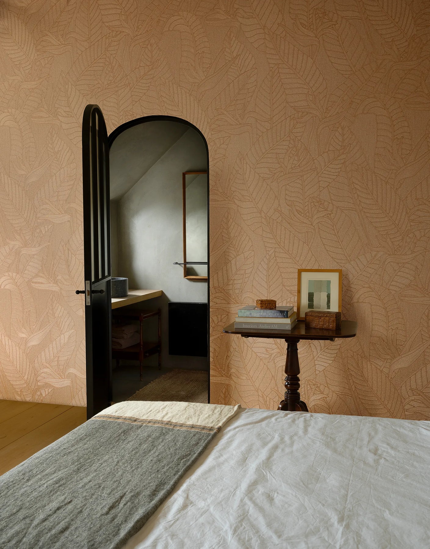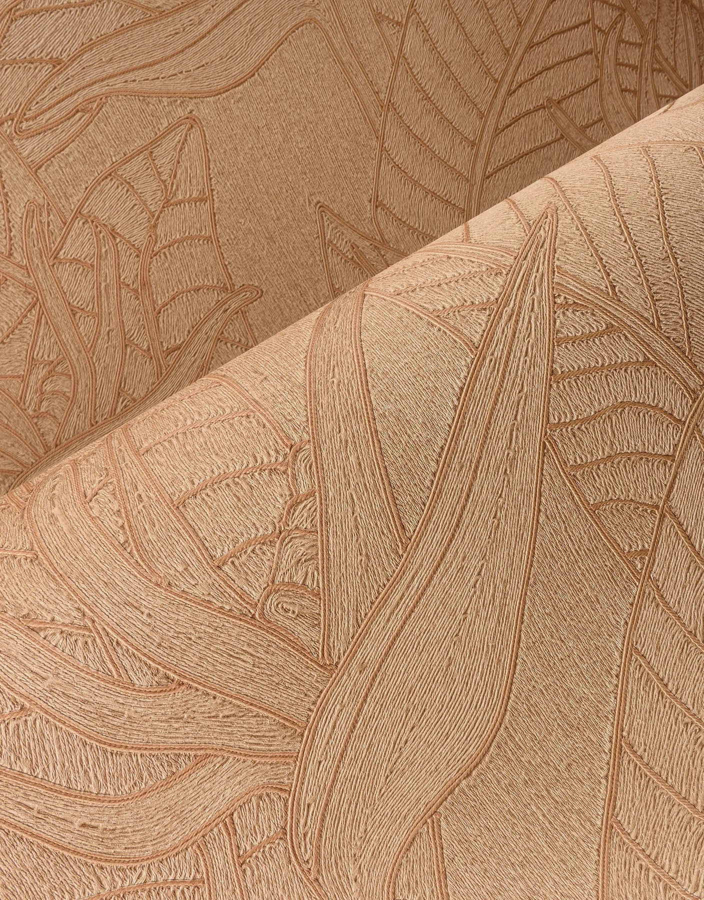 Ubud Orange ist eine Premium-Vinyltapete auf Papier, die die anmutigen Formen der Paradiesvogelblume meisterlich inszeniert. Die Blüten und Blätter wurden ursprünglich in akribischer Handarbeit mit feinen Fäden gestaltet und anschließend in ein hochwertiges Vinyl-Muster übertragen, das die reliefartige Struktur lebendig wiedergibt.