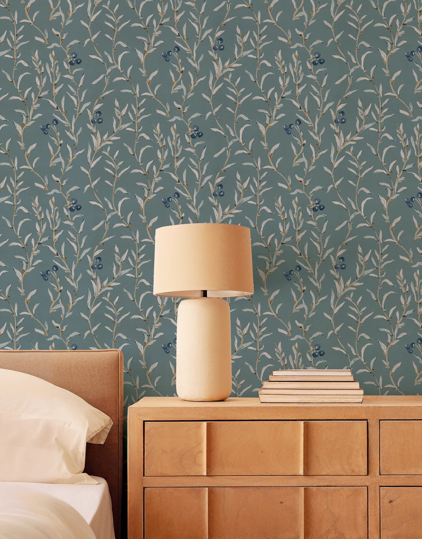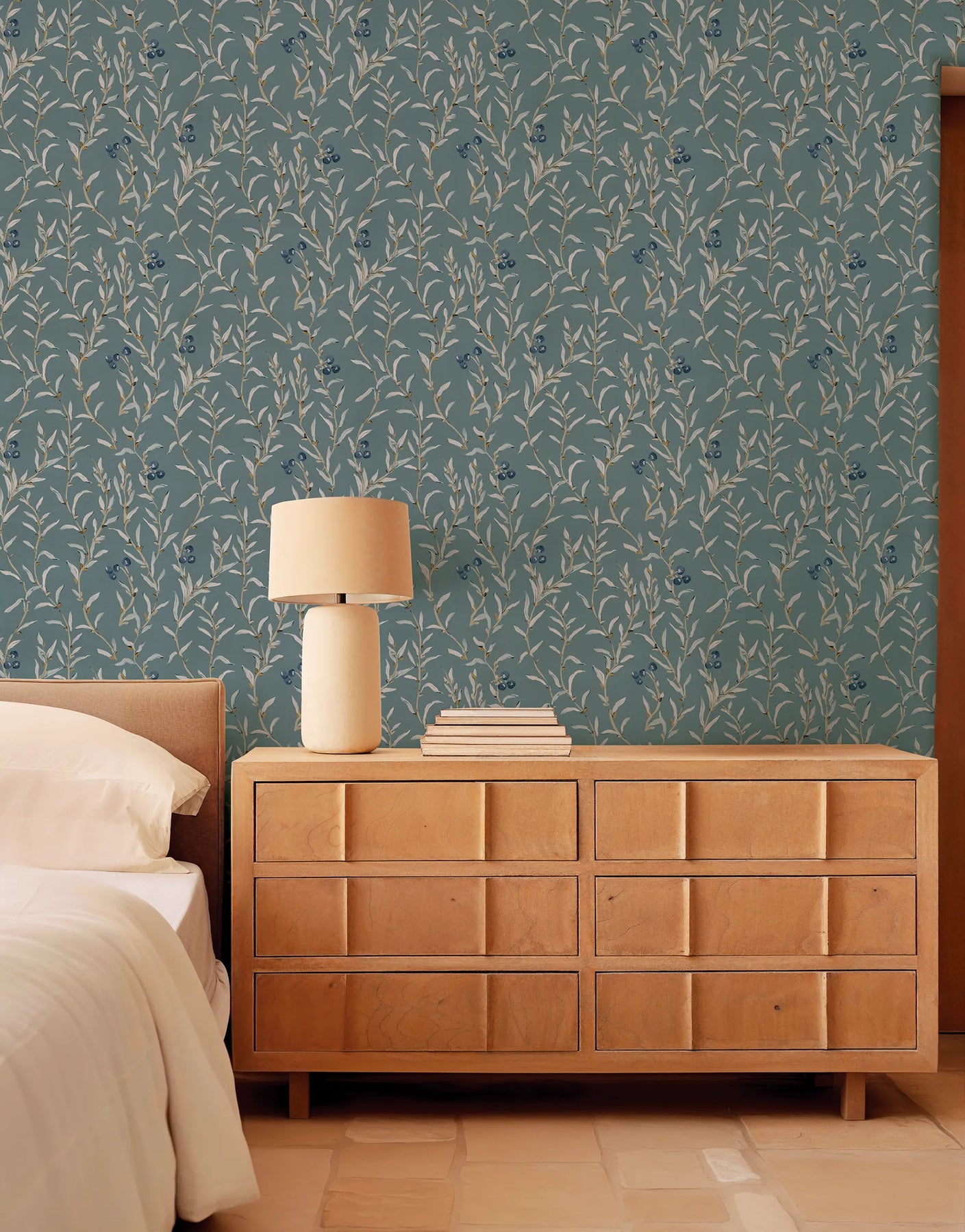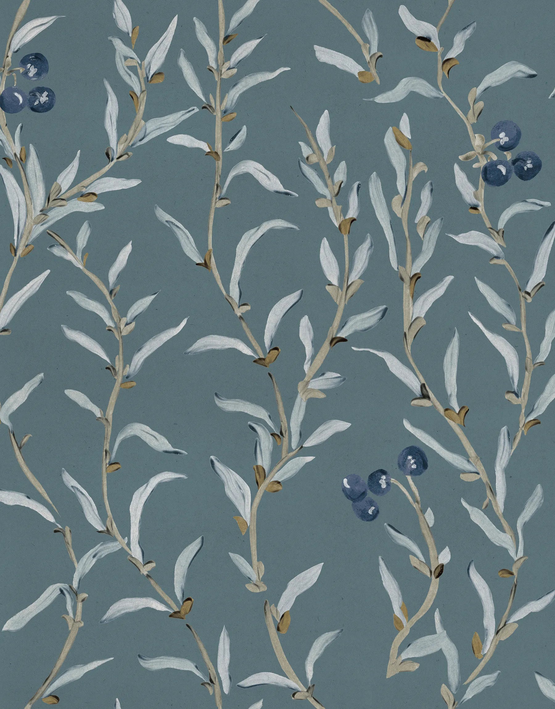 Die Thorn Tapete verbindet harmonisches Taubenblau mit fein gezeichneten Ästen, Zweigen und Schwarzdorn Beeren zu einem lebendigen, aber zugleich beruhigenden Design. Das detailreiche florale Muster erinnert an englische Landgärten – elegant, filigran und voller natürlicher Bewegung.
