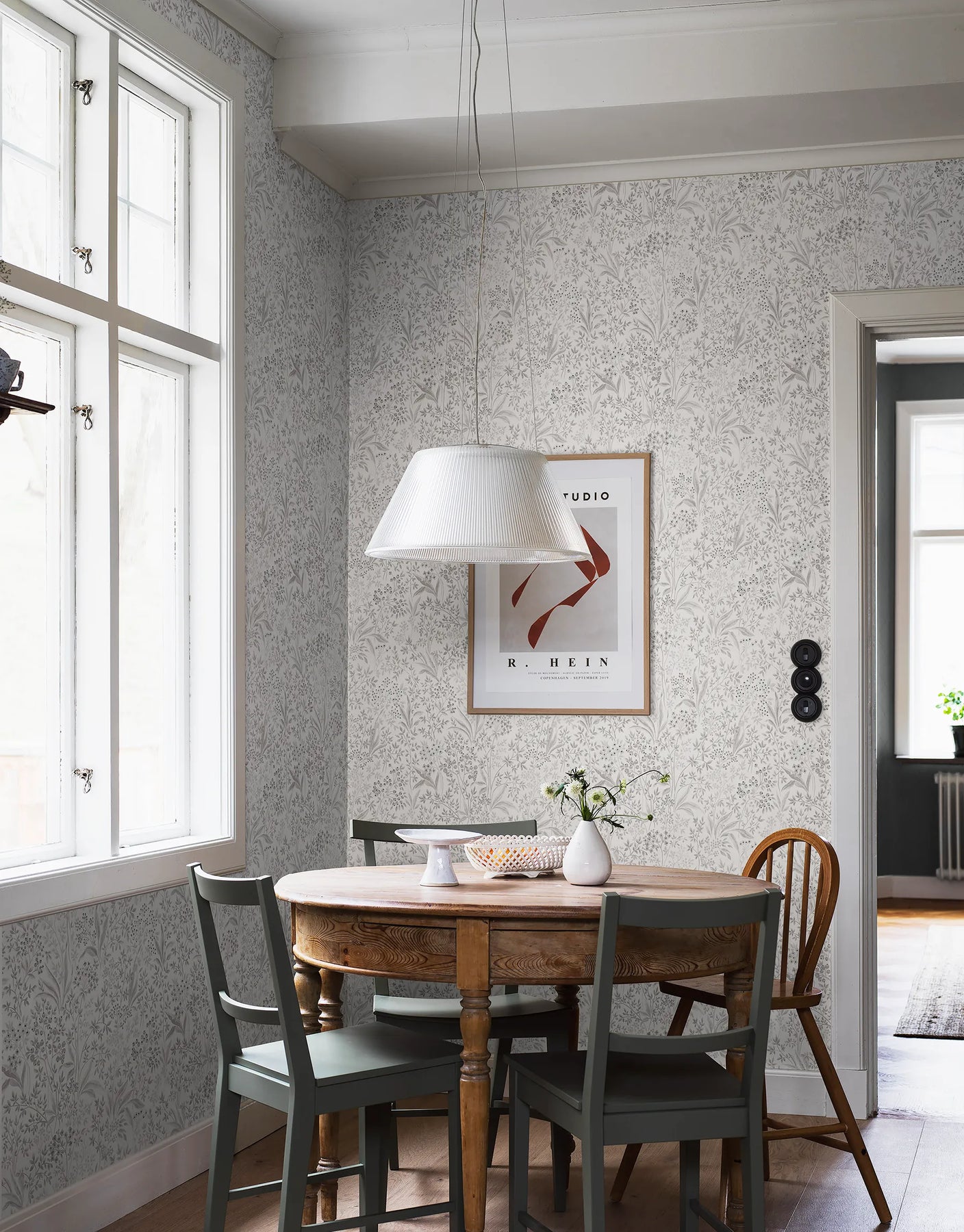 Unsere Alva Vliestapete in Grau begeistert mit einem kunstvollen Blätter-, Zweig- und Ästemotiv in harmonischen Grautönen auf hellem Grund. Das dichte Muster wirkt lebendig, ohne aufdringlich zu sein, und schafft eine elegante Balance zwischen Klassik und Moderne. Feine anthrazitfarbene Akzente auf den kleinen Beeren verleihen dem Design zusätzliche Tiefe und einen dezent modernen Kontrast. Die glatte, matte Oberfläche erinnert optisch an feinen Leimdruck und verleiht der Tapete eine handwerkliche, edle Struktur. Gefertigt auf hochwertigem Vlies ist sie langlebig, formstabil und leicht zu verarbeiten – perfekt für ein ruhiges, stilvolles Raumgefühl.