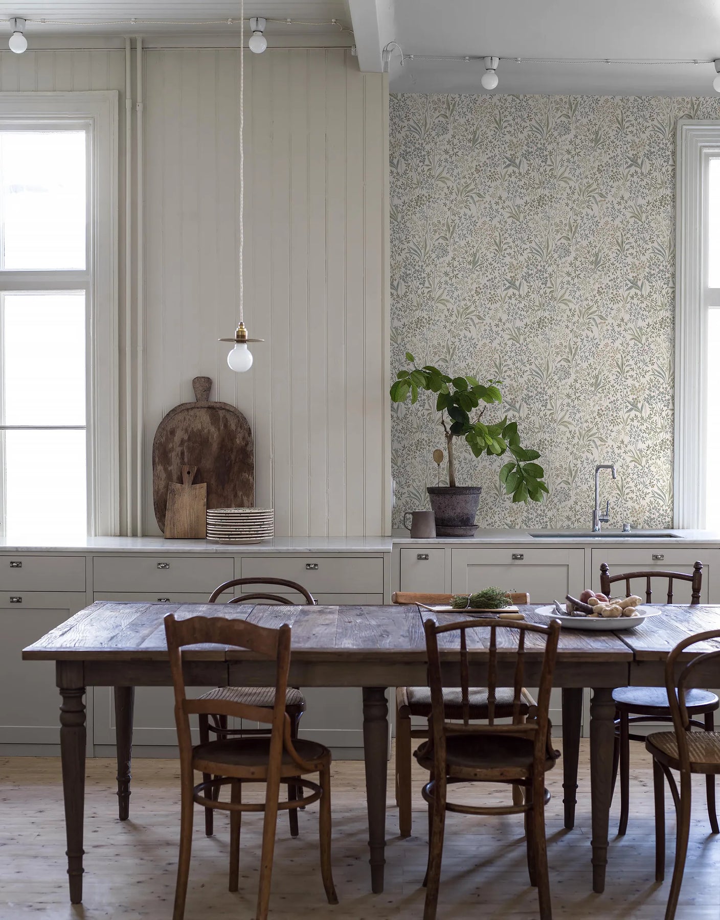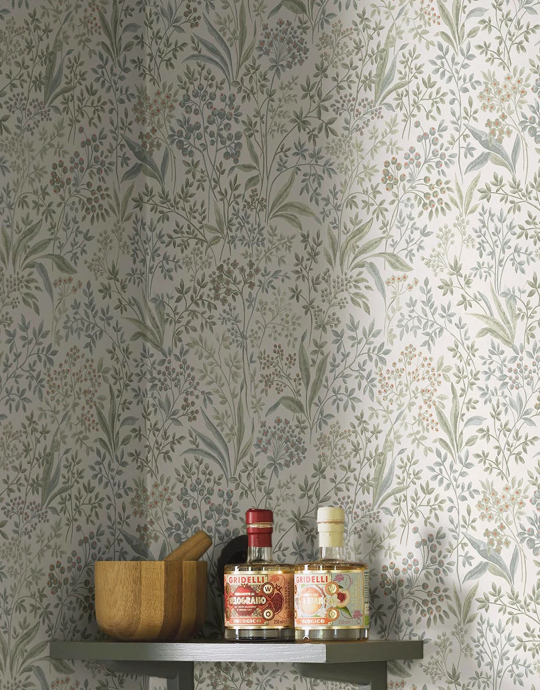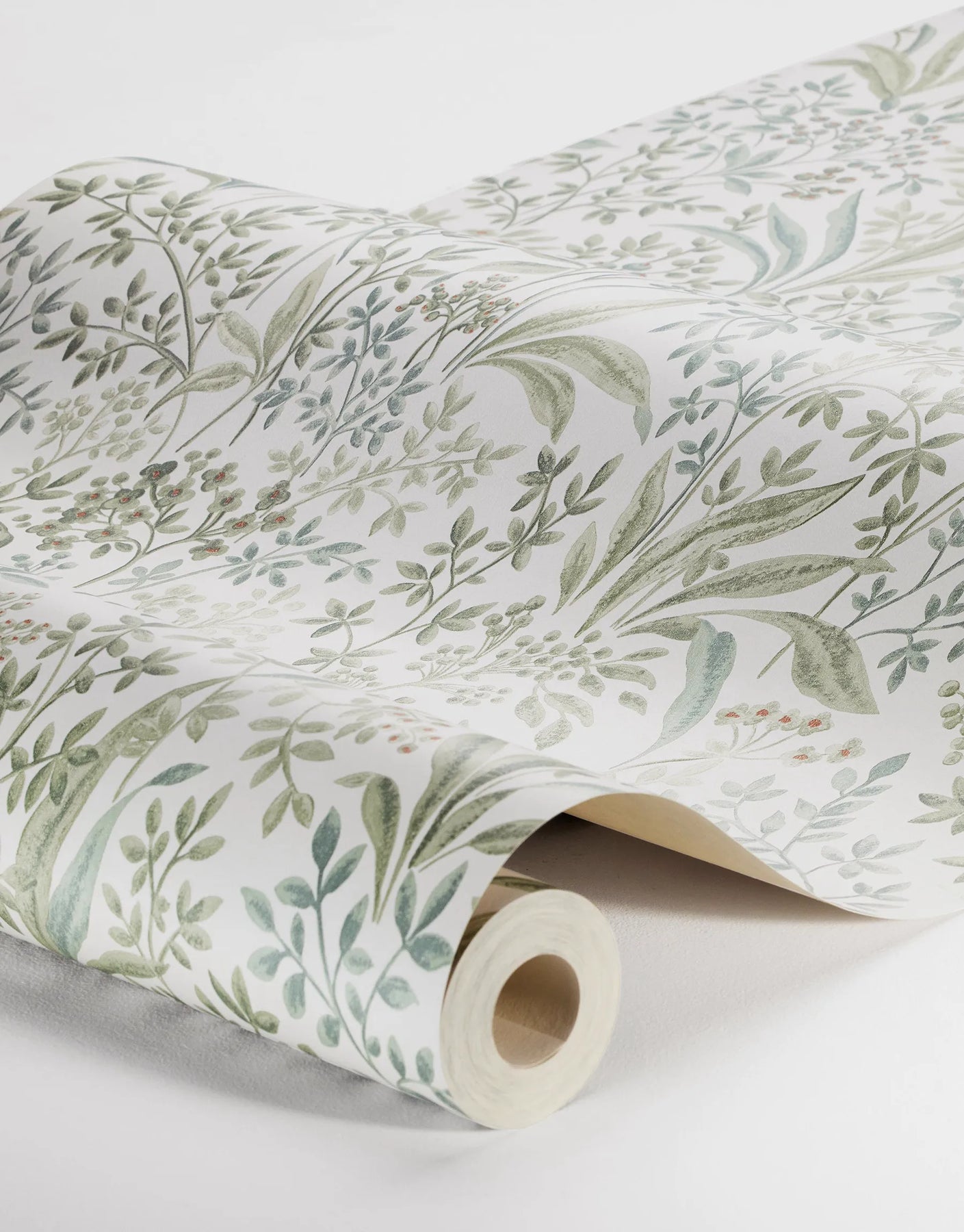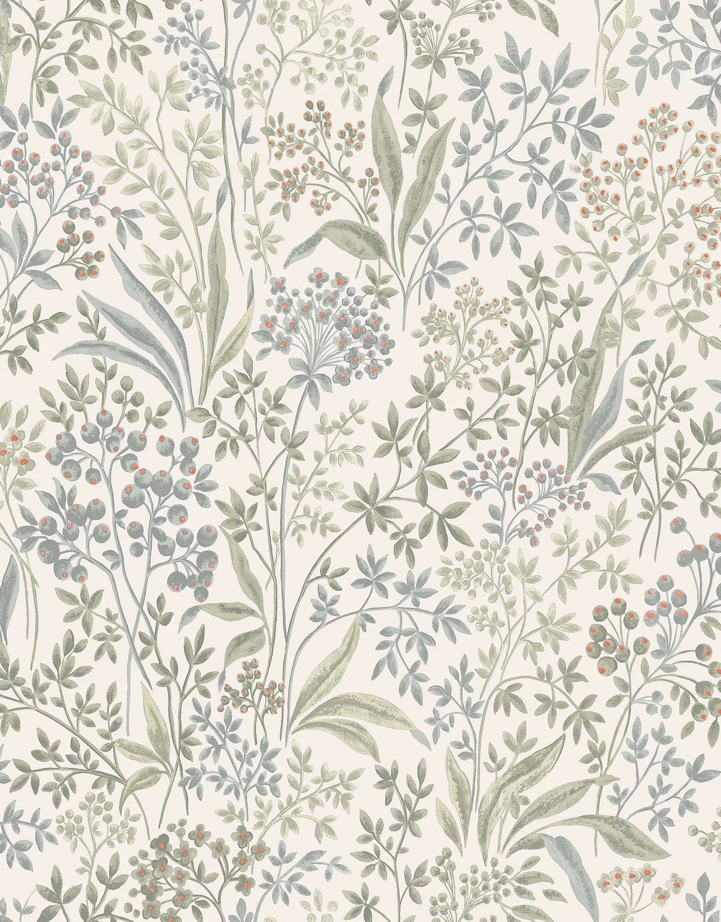 Die Alva Vliestapete in Hellgrün begeistert mit einem weißen Hintergrund und filigranen Zweigen, Blättern und Blüten in sanften Grüntönen. Das florale Muster feiert die Schönheit der Botanik und verleiht jedem Raum natürliche Leichtigkeit und skandinavische Eleganz.