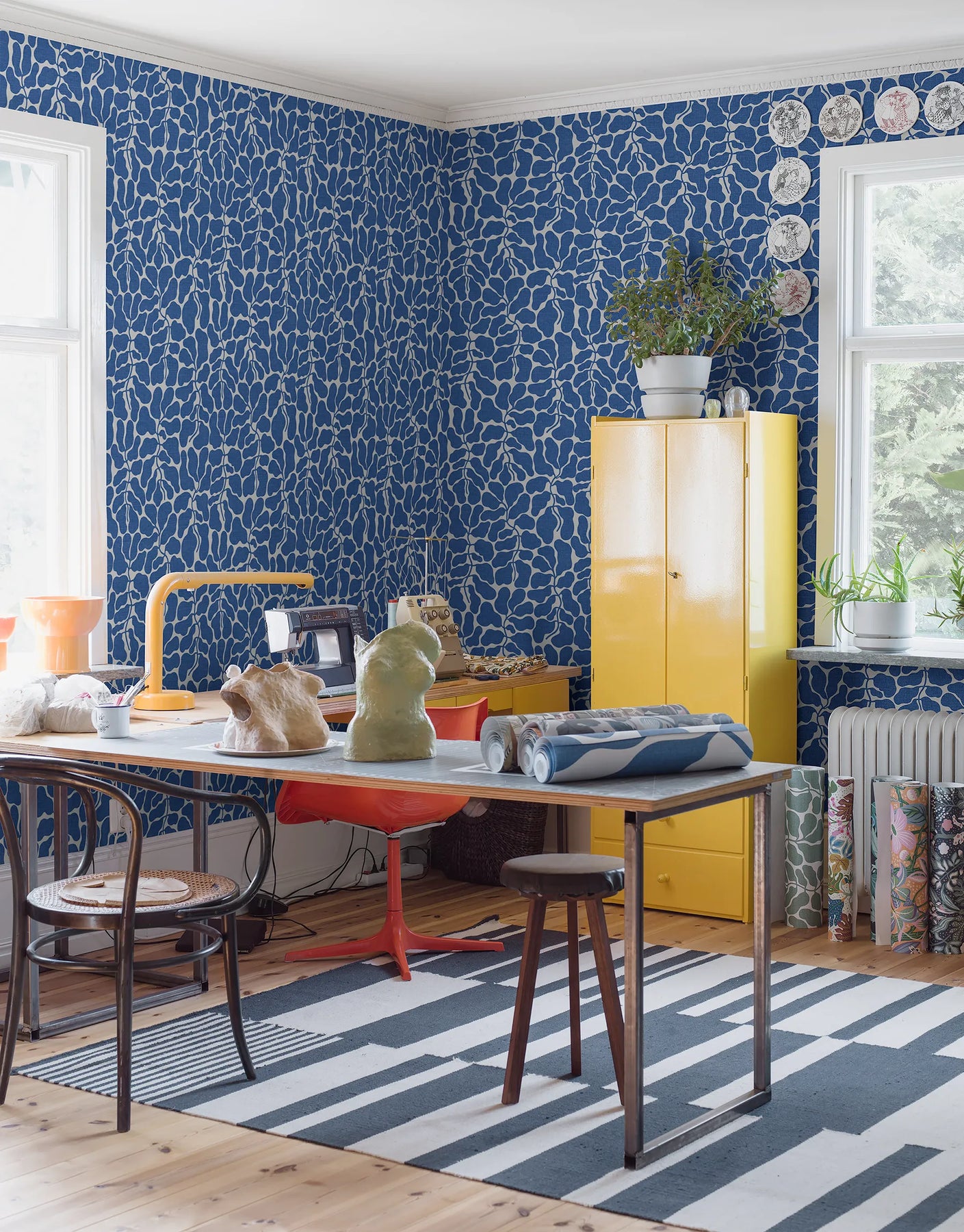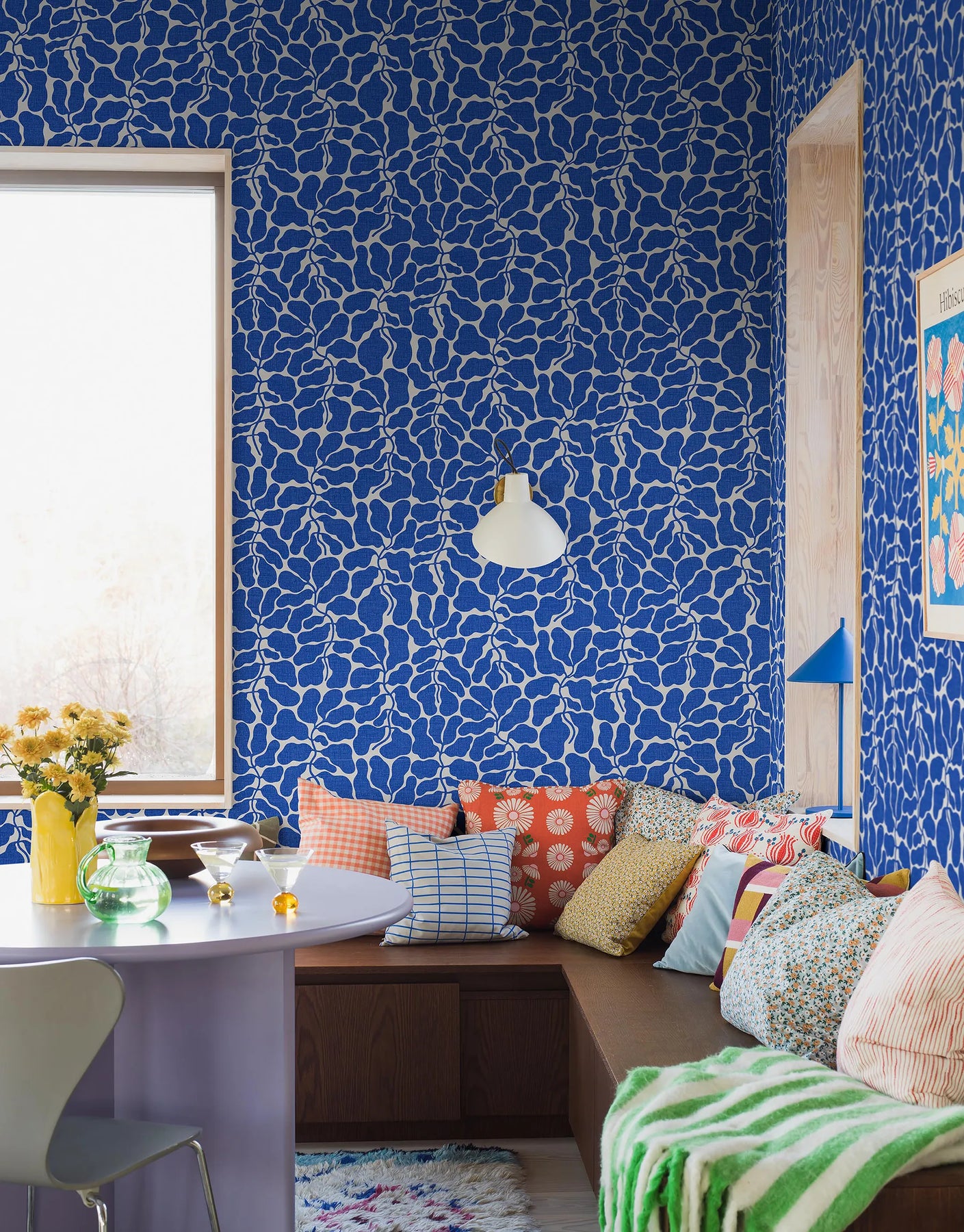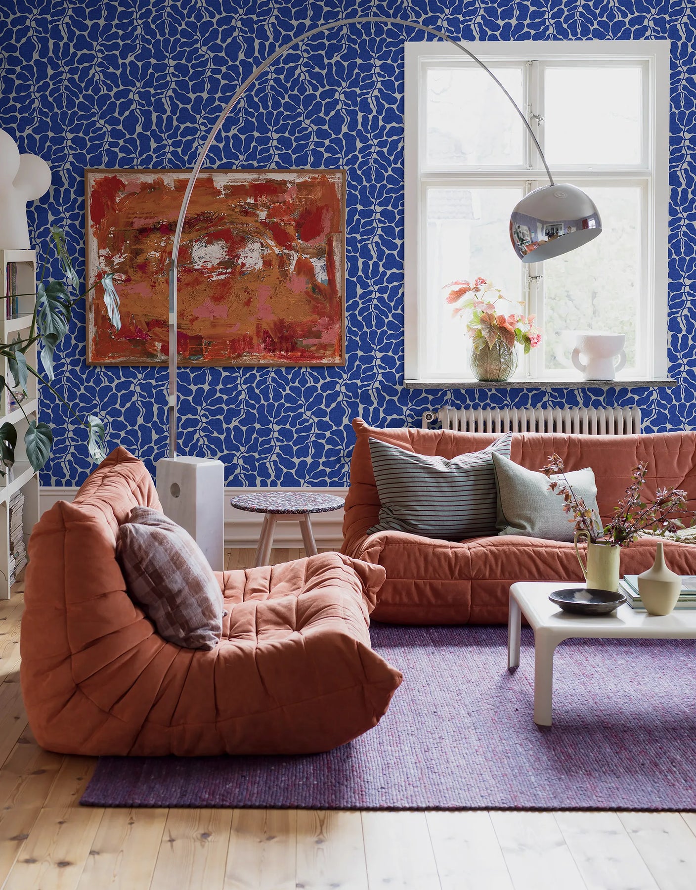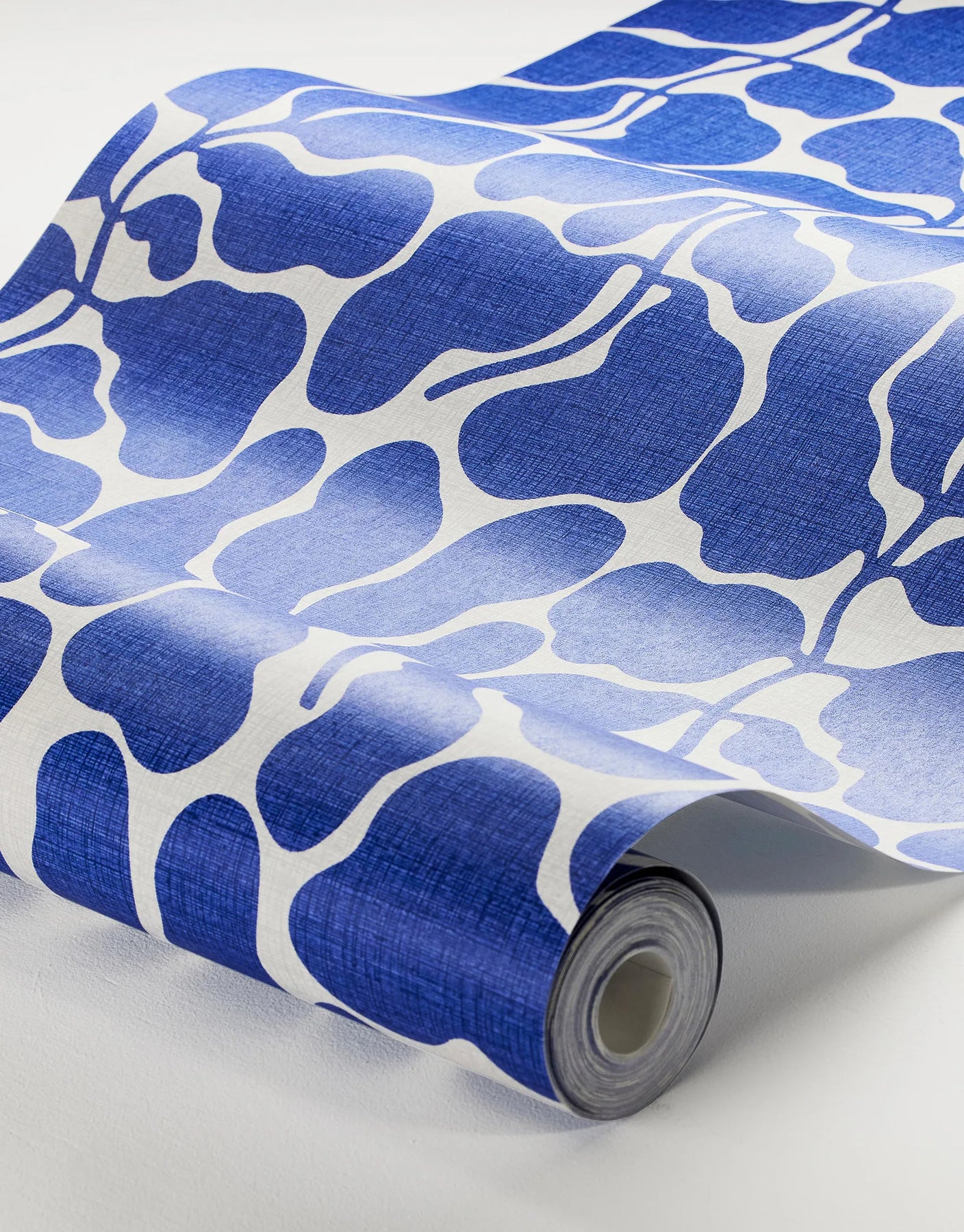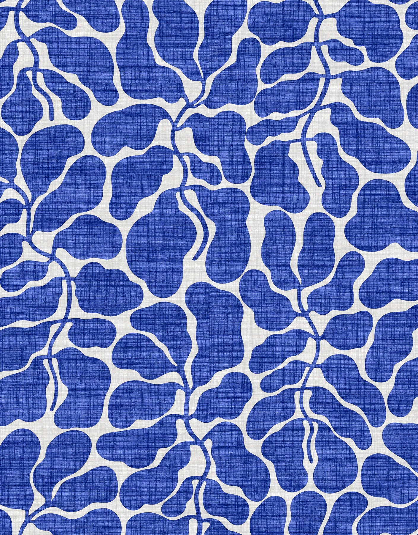 In sattem, tiefem Blau wirkt dieses pop-up-artige Retrodesign besonders intensiv und zugleich elegant. Die tanzenden Blattformen entfalten auf dem klaren Weiß eine starke grafische Präsenz, während die feine Leinwandstruktur dem Muster eine künstlerische, fast gemalte Anmutung gibt. Das Zusammenspiel aus kräftiger Farbe und organischer Form schafft eine spannende Balance aus Ruhe und Dynamik. Ob im Wohnzimmer, Essbereich oder Flur – dieses Design wird garantiert zum modernen Statement-Piece und verleiht Ihrem Zuhause eine frische, kunstvolle Note.